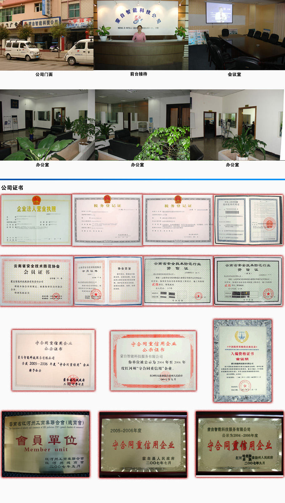 云南省蒙自县智能科技服务有限责任公司,是在蒙自县工商局注册的私营企业, 主要从事安保系列产品(闭路监控系统、防盗报警系统、楼宇对讲系统等)。公司成立于1998年9月。公司成立以来,本着“科技为本,敬业为尊”的宗旨,积极投身于安全防范事业,为客户所需为客户所急,将技防和人防有力地结合起来。随着“个开蒙”群落城市的启动,本公司的服务更适应本地区的经济发展。